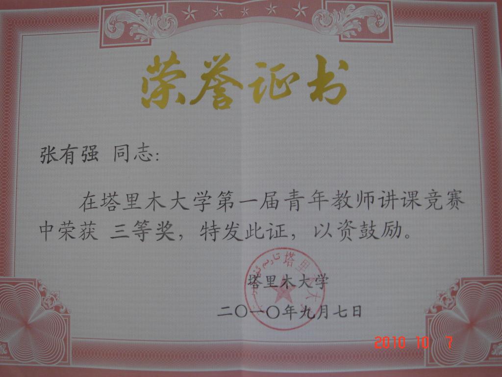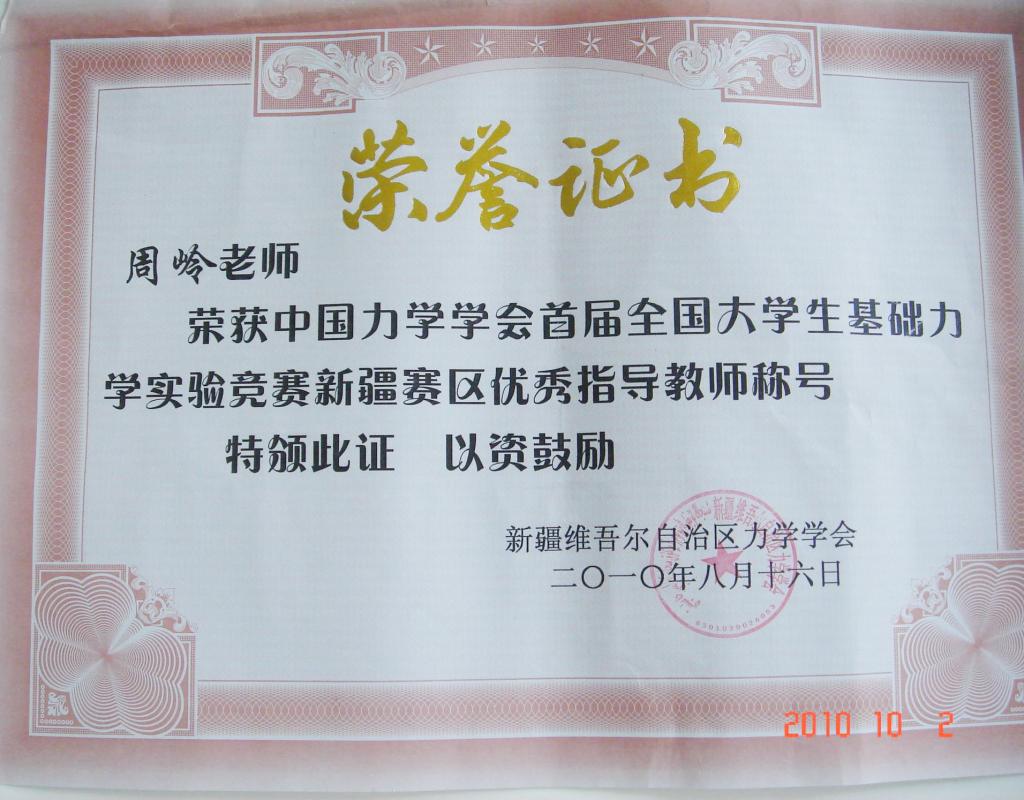 全国首届大学生基础力学实验竞赛新疆赛区优秀指导教师称号,2010 |