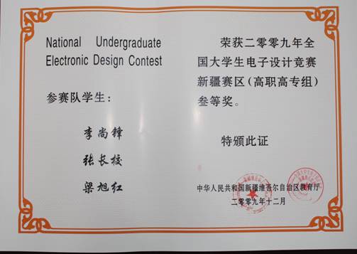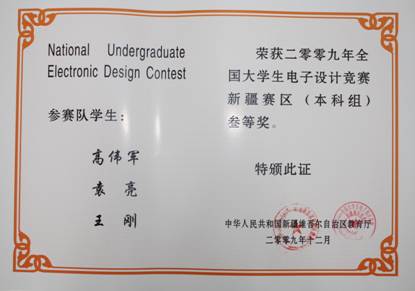 2009年9月全国大学生电子设计竞赛新疆赛区比赛。我校校派出三支大学生电子设计竞赛参赛队,其中付宗国、麦冬、郭志成三人以作品《光伏并网发电模拟装置》获得自治区三等奖;袁亮、王刚、高伟军三人以作品《电能收集充电器》获得自治区三等奖;李尚锋、张长校、梁旭红三人以作品《模拟路灯控制系统》获得自治区三等奖。